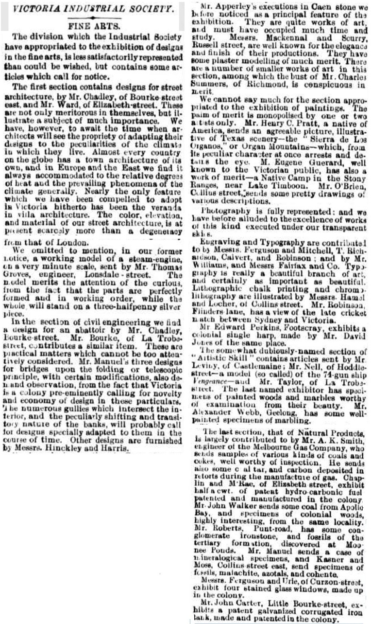 The Victorian Industrial Society was established to advise and promote industrialisation in Victoria from all sectors of industry. The society held exhibits from 1851 granting awards as a means of promotion for the socity and exhibitors.