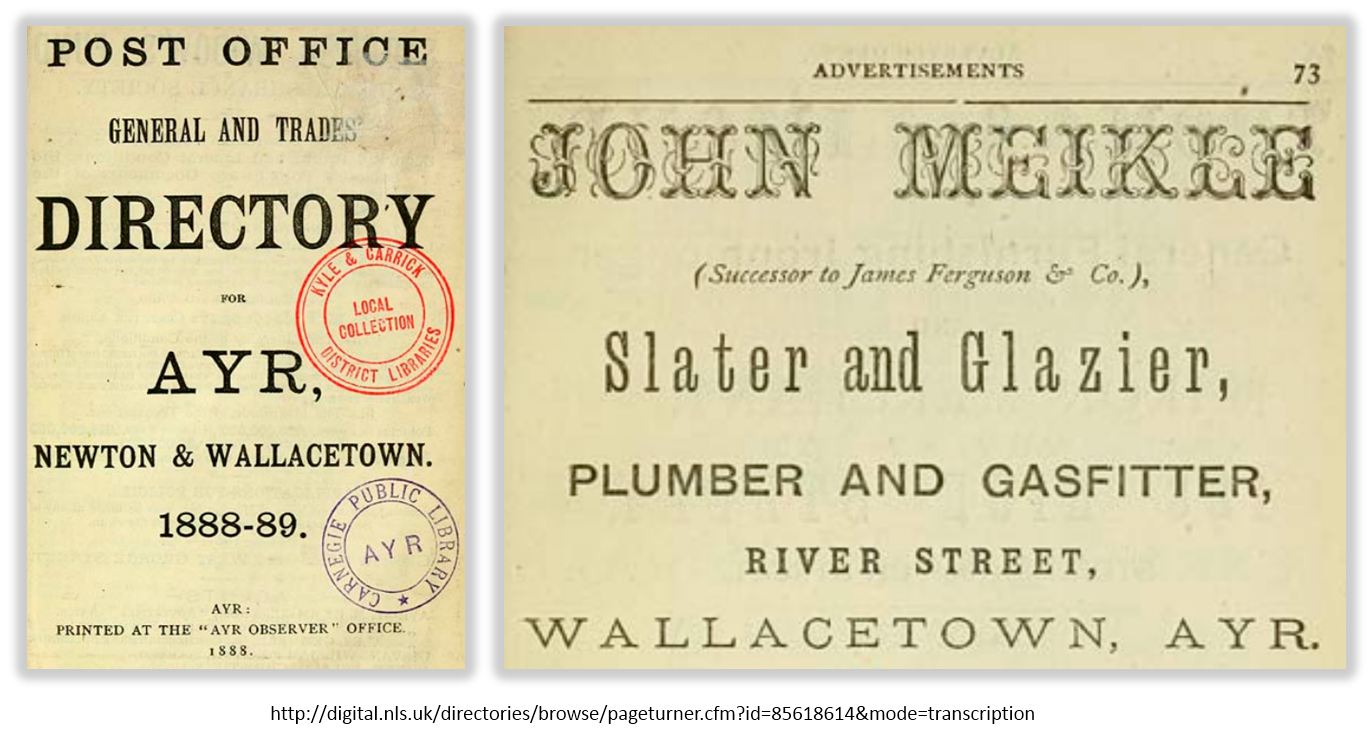 David returned to Scotland and re-joined his father (James Ferguson Snr, 1777-1866) in the Plumbing, Slating and Glazing Business in River Street Wallacetown. In 1859 James Ferguson Snr was declared bankrupt, but this was not the demise of his business. When James Snr died in 1866 it would appear that David carried on the business as sole proprietor.