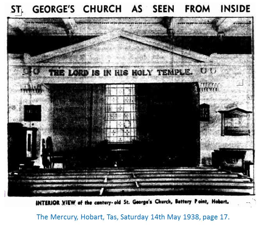 “The chancel in connection with St. John’s Church, Launceston, has been finished, and a portion of the service has been conducted in it. The Bishop, it is anticipated, will visit the north in a week or two, when the building will be consecrated. Two handsome stained-glass windows have been erected in the chancel. One is the gift of the late John Cameron, Esq., and represents the Ascension. A half figure of our Saviour is exhibited at the bottom of a centre light, and above that is the Ascension with the words beneath “I go to prepare a place for you.” On either side are the eleven Apostles, looking with wonder and adoration to their ascending Lord. At the top is the figure of a dove. The work does infinite credit to Messrs. Ferguson and Urie, of Melbourne, by whom it was designed and executed. The antique glass – which is a late discovery of the glass used by glass painters in the middle ages – has a very rich although subdued tone, and being heavy in substance gives great additional strength to the window. This contrasts favourably with the smaller window, the resurrection, the gift of the Rev. Dr. Browne, chaplain, in memory of the Venerable Archdeacon Hutchins, the first Archdeacon appointed to the diocese. This window is of common glass, by Headsland [sic: ‘Hedgeland’], of London”.