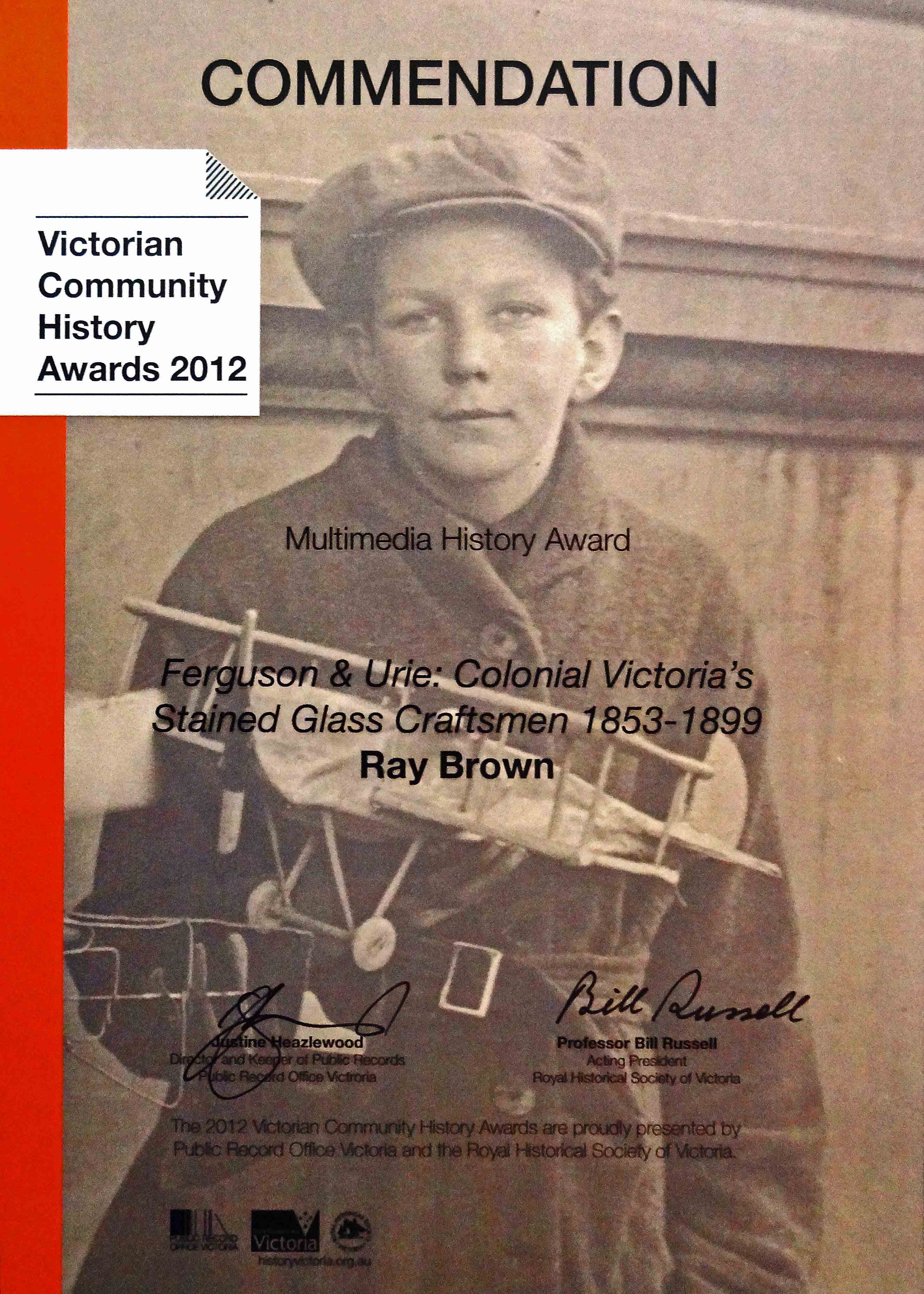 ♦ Attended the Victorian Community History Awards at the National Gallery today. Surprisingly, this web site, “Ferguson & Urie: Colonial Victoria’s Historical Stained Glass Craftsmen 1853-1899” was shortlisted for the Multimedia History category (see award). Over 160 entries in total were submitted to this years awards so I was quite surprised to be standing there as one of five contenders for the Multimedia award. No first prize obviously but a commendation See links for awards booklet and entries list on the History Victoria Web Site.